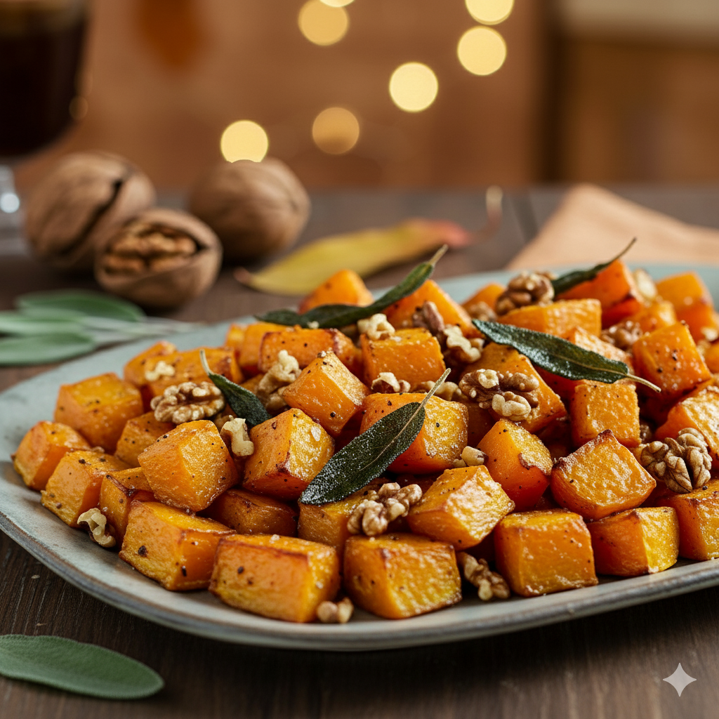 A cozy fall favorite: roasted squash tossed with walnuts and crispy sage