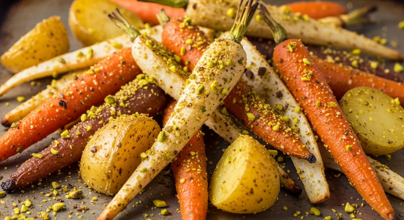 Ditch the boring veggies! These roasted root vegetables get an incredible crunch and flavor boost from a vibrant pistachio spice blend. Your new favorite way to eat